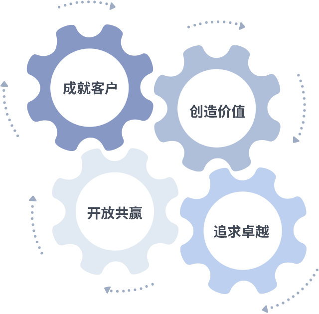 成就客户是一切决策的出发点,创造价值是衡量所有工作的标准,追求卓越是XPJ做事做人的态度,开放共赢是XPJ的格局也是最终的结果。价值观的齿轮环环相扣,推动着组织里的每个人不断向前。